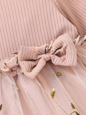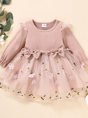 Baby Girls Mesh Dress Long Sleeve Bow Floral Embroidered Princess Dress Clothes Pink
