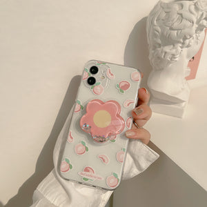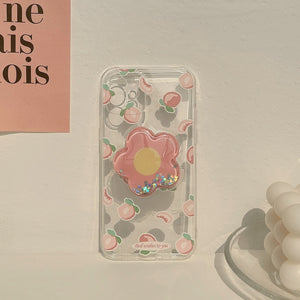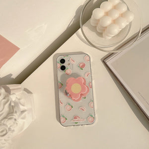 Pink Peach Pattern Transparent Phone Case With Flower Shaped Finger Grip