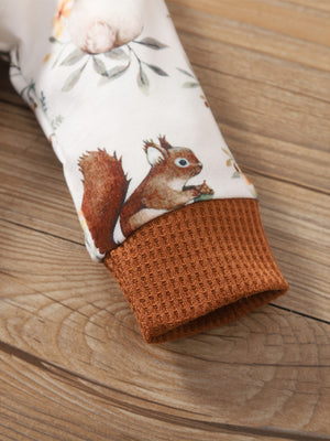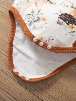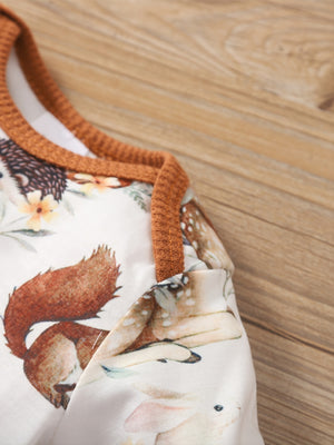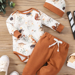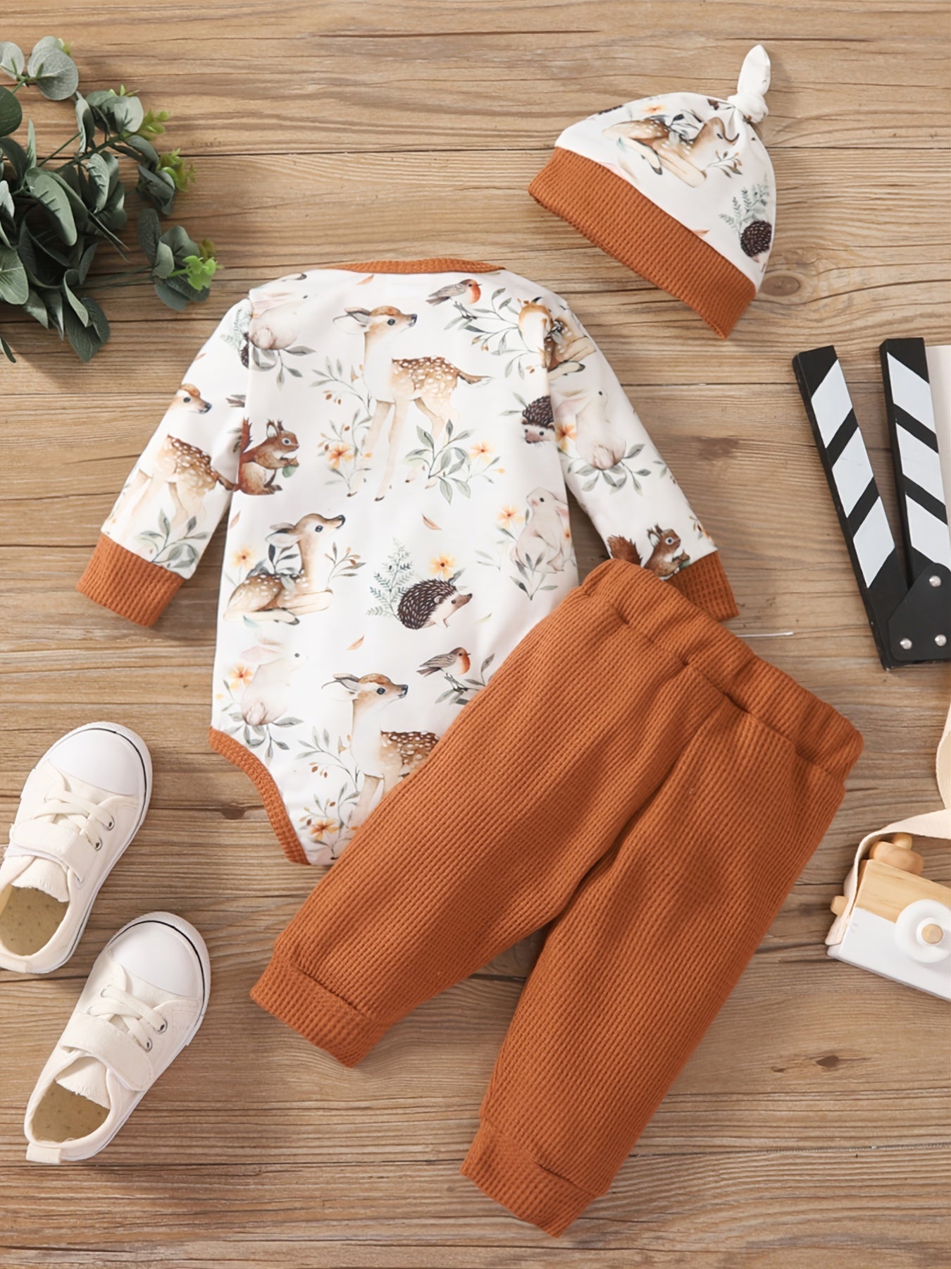 3pcs Newborn Infant Cute Animal Print Romper Long Sleeve Crew Neck Bodysuit & Pants & Hat Set For Baby Boys And Girls Toddler Clothes