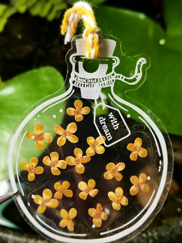 The beautiful dried flowers are pressed on the transparent bookmark, elegant and vivid, full of freshness.