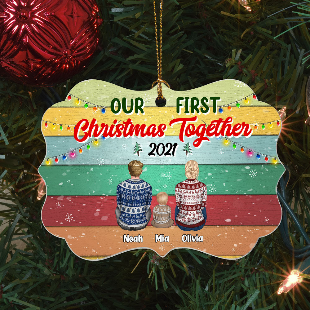 Our First Christmas Together - Personalized Aluminum Ornament - Christmas Gift For Parents With Newborn Baby - Ugly Christmas Sweater Sitting