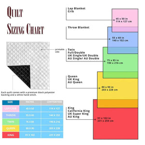Quilt Lap/Crib 45x50, Quilt Throw 55x60, Quilt Twin 75x85, Quilt Queen 80x90, Quilt King 91x102, Blanket Youth 43x56, Blanket Large 54x70, Blanket XLarge 60x80 |
