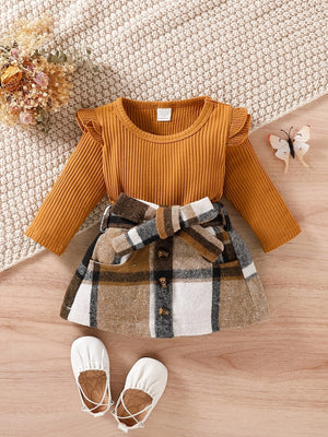 Home Baby Girls Ruffled Knitted Sweater & Plaid Bow Skirt Set For Winter