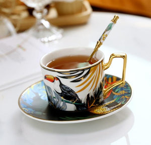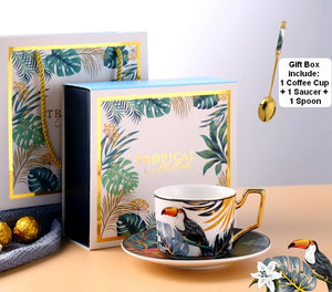 Elegant Tea Cups and Saucers, Jungle Toucan Pattern Porcelain Coffee Cups, Coffee Cups with Gold Trim and Gift Box