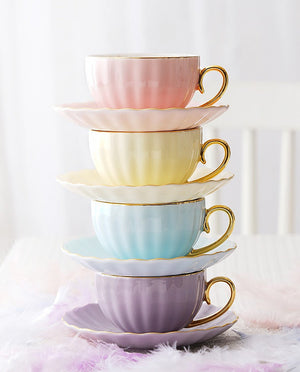 Purple: 1 Tea Cup + 1 Saucer, Light Blue: 1 Tea Cup + 1 Saucer, Pink: 1 Tea Cup + 1 Saucer, Yellow: 1 Tea Cup + 1 Saucer