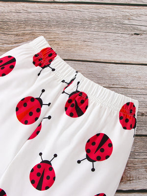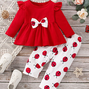 2pcs/Set Baby Girls Flying Sleeve Long Sleeve Bow Top & Cartoon Ladybug Print Pants Baby Clothes