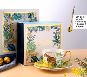 Jungle Pattern Porcelain Coffee Cups. Tea Cups and Saucers. Coffee Cups with Gold Trim and Gift Box