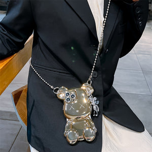 Cute 3D Cartoon Silver Goolden Teddy Bear Shaped Phone Case With Metal Chain Strap Bell Pendant